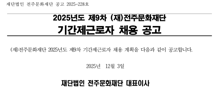 2025년도 제9차 (재)전주문화재단 기간제근로자 채용 공고 전주다움2025-12-05조회 15 첨부파일 [붙임1]2025년도 (재)전주문화재단 기간제근로자 채용 공고(최종).pdf (212.9 KB) [붙임2]기간제근로자 채용 응시 서식.hwp (68.0 KB) 목록 이전글 덕진구청 생활복지과 의료급여 (전산관리업무) 기간제근로자 채용공고 다음글 2026년 특성화도서관 기간제 근로자 채용 공고
