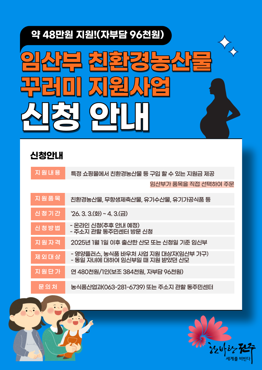 2026년 임산부 친환경농산물 꾸러미 지원사업 신청 안내 전주다움2026-01-28조회 37 목록 이전글 2026년 청년농업인 스마트리더과정 대상자 모집 안내 다음글 에너지바우처 등유 및 LPG 사용 수급가구에 지원금 확대