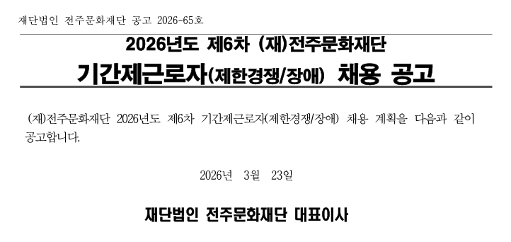 2026년도 제6차 (재)전주문화재단 기간제근로자(제한경쟁/장애전형) 채용 공고 전주다움2026-03-27조회 15 첨부파일 [붙임1]2026년도 제6차 (재)전주문화재단 기간제근로자 채용 공고.pdf (200.9 KB) [붙임2]제6차 기간제근로자 채용 응시 서식.hwp (59.0 KB) 목록 이전글 2026년도 제1차 (재)전주문화재단 직원 채용 공고 다음글 2026년 아시아이주여성쉼터 상담원 채용 공고