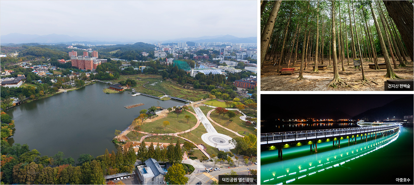 왕의 궁원 프로젝트에서는 전주의 역사적 골격이 새롭게 복원되는 동시에 아중호수, 건지산, 덕진공원이 새로운 관광 거점으로 재창조된다. 기린봉 아래의 아중호수에서는 완산팔경 중 하나로 손꼽힌 기린토월이 현대적인 감각으로 재탄생된다. 2026년까지 디지털 야간경관 조성사업이 진행 중이다. 앞으로 빛과 음악, 영상이 어우러진 야간 관광 명소로 거듭날 예정이다. 건지산은 조선 왕실의 뿌리라 할 수 있는 조경단이 모셔진 유서 깊은 산으로, 숲 전체가 ‘왕실 숲’으로 불린다. 조경단은 현재 국가문화유산 승격을 추진 중이며, 건지산 전체가 시민이 역사와 자연을 함께 체험할 수 있는 역사문화 생태 공간으로 재정비되고 있다. 덕진공원은 전주의 전통 정원으로, 열린광장 조성, 보행 네트워크 개선, 경관 조명 설치 등 재정비를 마쳤다. 시민에게는 일상 속 쉼터로, 관광객에게는 머무는 명소로 다시 태어났다. 세 공간은 한옥마을로 이어지는 관광축의 중심이자, 전주의 문화관광산업에 새로운 역동성을 더해 주는 공간이다.