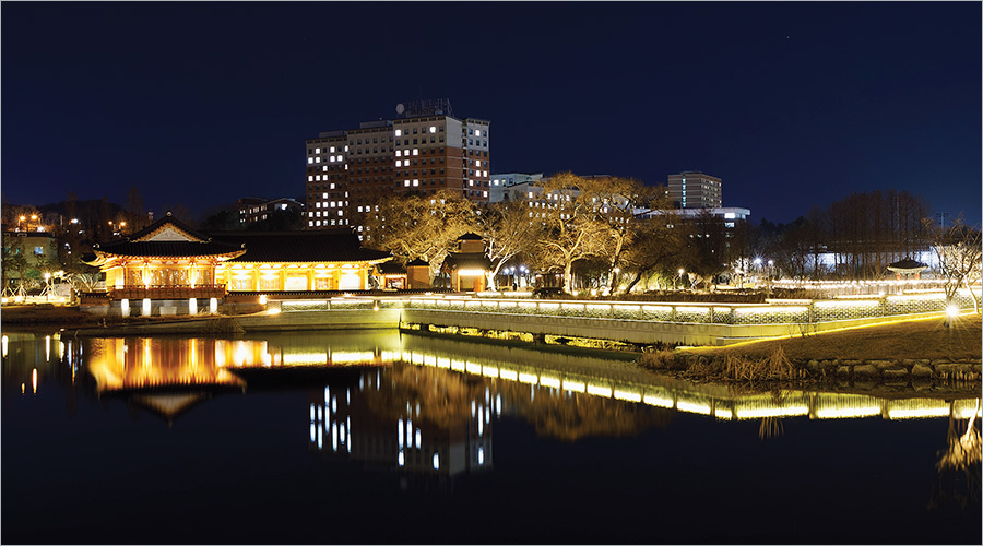 오랜 시간 전주 시민의 사랑을 받아 온 덕진공원. 호수를 중심으로 다양한 볼거리와 즐길 거리가 즐비해 많은 이들의 발걸음이 이어지고 있다. 특히 수질과 생태계 환경을 좋게 만들며 멸종위기 야생동물 1급인 수달이 찾아오는 도심 속 생태공원으로 거듭났다. 공원을 가로지르는 연화교를 천천히 거닐며 호수의 잔잔한 물결을 눈에 담는다. 연꽃이 피는 계절에 온다면 더없이 화려한 모습이겠다. 호수 위에 떠 있는 연화정도서관도 들러 본다. 한옥으로 지은 정갈한 도서관에 앉아 책을 음미하다가 창 너머로 시선을 옮기면, 나직한 호수의 일렁임에 마음이 평화로워진다. 아이들과 공원에 왔다면 숲 놀이터도 가 보자. 나무가 내어 준 공간에서 맘껏 뛰놀 수 있어 시간 가는 줄 모른다. 밤에는 더욱 반짝인다. 새롭게 단장한 열린 광장에서 느린 산책을 하는 것도 좋겠다. 조명으로 물든 공원의 밤 풍경이 한눈에 보이며 감탄을 자아낸다. 광장 바닥에는 조선 시대 별자리 고지도 ‘천상열차분야지도’가 알록달록한 빛을 뿜고 있어 더욱 눈길을 끈다.