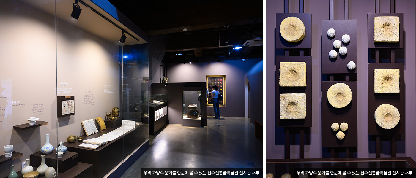 전주한옥마을을 걷다가 목이 칼칼할 때쯤 만나는 전주전통술박물관. 한옥풍의 전통술박물관엔 우리 가양주 문화가 누룩의 발효처럼 살아 있다. 먼저 전시관에서 체계적으로 접하는 가양주 문화는 문외한에게도 입문서 같은 길잡이가 된다. 교육체험관에선 우리 전통주의 에피소드를 듣는 듯 흥미진진한 교육을 받으며, 발효주와 증류주를 맛보는 체험을 할 수 있다. 수을갤러리에선 여러 전통주를 맛보고 구매할 수 있으므로 전시관, 교육체험관, 수을갤러리 순서로 둘러보면 좋다.