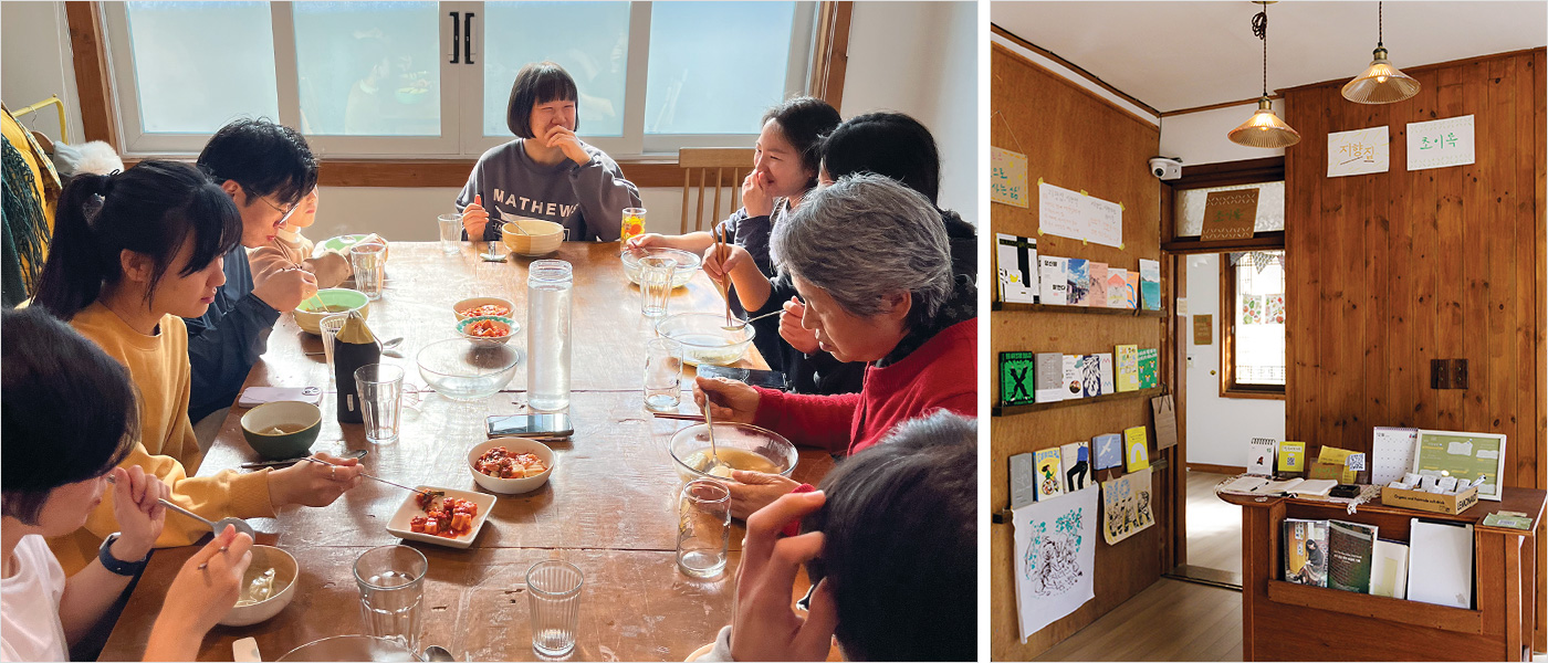 물질적인 후원이 아니더라도 자신의 재능을 맘껏 발휘해 프로그램을 운영해도 좋고, 청소와 관리를 도우며 공간 운영에 도움을 줄 수도 있다. 단순히 모임에 참여하거나 공유 책장을 사용하고, 지향집 속 비건 식료품 가게인 초이록에서 식재료를 구매할 수도 있다. 지향집은 사람들이 가지고 있는 ‘생활 기술’에 주목했다. 자격증과 수치로 환산되지 않아 가치 없다고 여겨지는 그 기술들은 사실 귀한 자산이다. 특히 요리는 스스로에게 먹거리를 준비하는 능력으로 주체성과도 맞닿아 있다. 이를 알리고 싶어 ‘지향집밥’ 프로그램과 반찬 모임인 ‘찬찬찬’을 진행했다. 매년 1인 가구들을 위한 ‘비건 김장’ 모임도 해 왔다. 지향집에서 머무는 모두가 운영자이자 참여자다. 바느질과 뜨개 수선 모임에 모인 이들은 옷을 사지 않고 오래 입을 수 있는 방법을 배운다. 애독가라면 좋아하는 책을 공유하고 독서 모임을 연다.